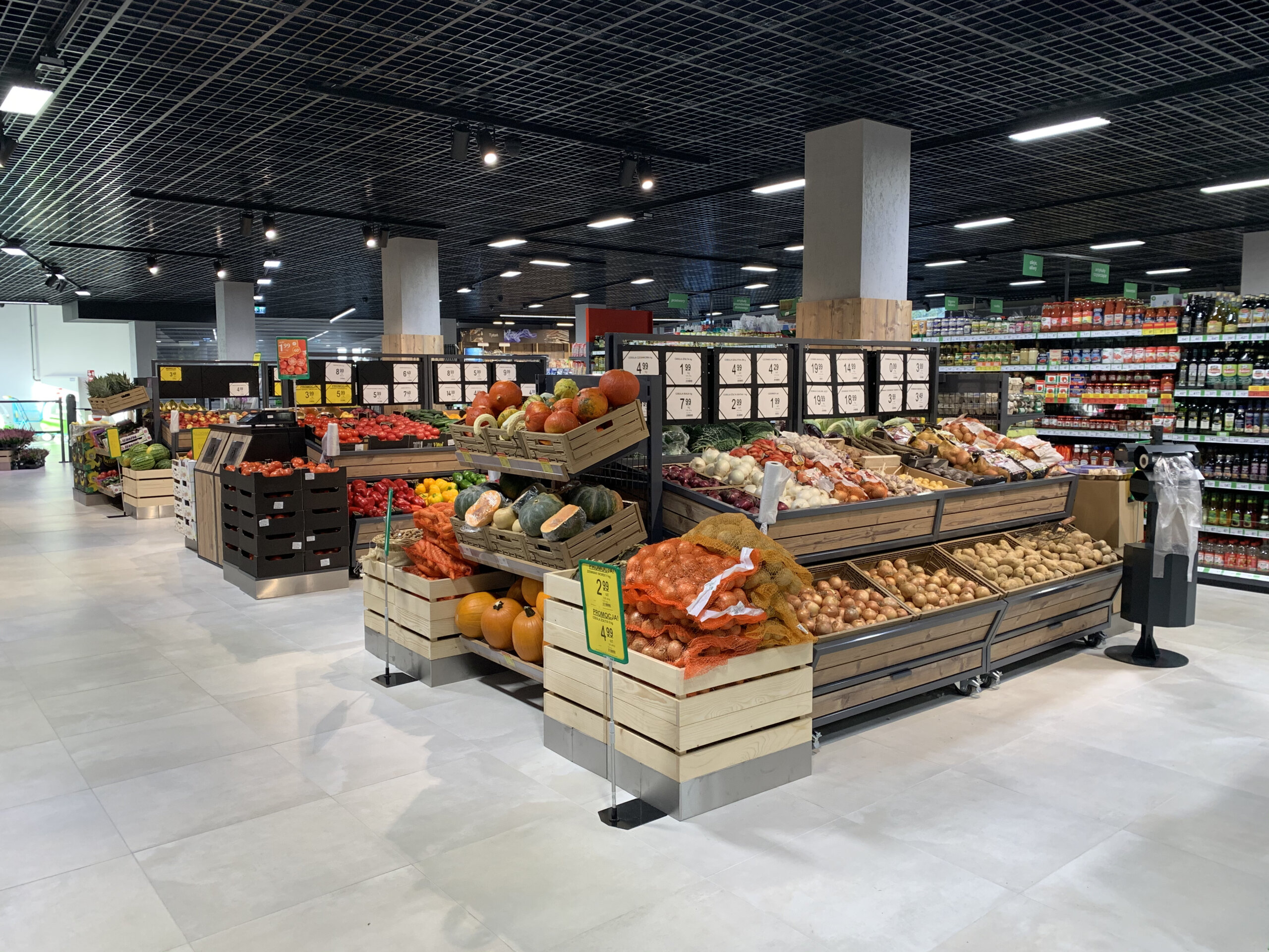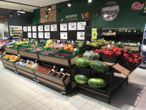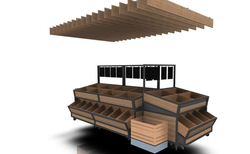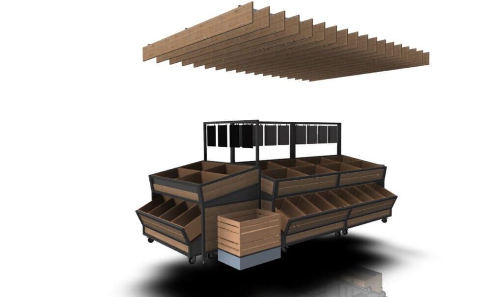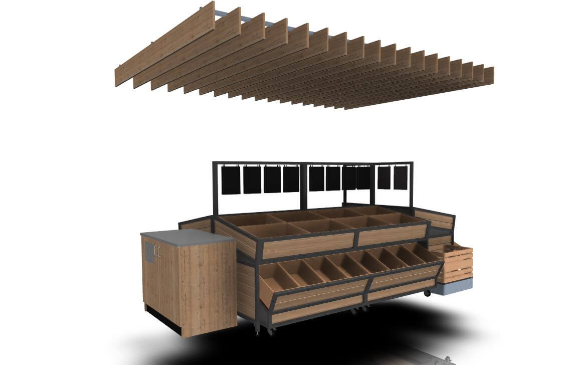 Wyspa na Warzywa i owoce NL to modułowe rozwiązanie, które łączy funkcjonalność z estetyką. Wyposażona w praktyczny wózek umieszczony pod spodem, może pełnić rolę dodatkowego ekspozytora, magazynu towarów lub być wysuwana, aby stworzyć spójną całość wyspy. Dzięki temu, nawet przy chwilowych brakach produktów, przestrzeń wygląda estetycznie. Modułowa konstrukcja pozwala na łatwe dostosowanie wyspy do potrzeb sklepu, zapewniając wygodną obsługę i doskonałą ekspozycję świeżych produktów.
